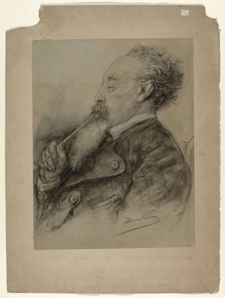 Curator: Immediately, the sketchiness lends itself to the caricature—the soft, grey tones enhancing the humorous effect. It almost feels incomplete, as if the artist was capturing a fleeting impression. Editor: Indeed, let's explore Elchanon Verveer's "Caricature Portrait of the Painter Martinus Wilhelmus Liernur", sometime between 1850 and 1899. It is now held at the Rijksmuseum. And yes, there's something immediately striking about the composition. It is dominated by Liernur's corpulent figure and, of course, the extravagantly long pipe jutting out. Curator: From a formalist perspective, consider the lines! Verveer uses them sparingly but with such precision. Note how a few strokes define the folds of his jacket or the curve of his belly. It's economical, almost effortless. The asymmetry in how his weight is distributed—leaning heavily to one side—adds to the unstable, jovial tone. Editor: It tells a story about the art world, right? Caricatures often served as a way to satirize or poke fun at prominent figures, reflecting the social dynamics and power structures within artistic circles. A successful, established artist depicted with humor shows his social position—one of acknowledged mastery that allowed him to be lightly ridiculed. Curator: And what do you make of the medium, this subtle pencil on paper? It contributes to the sense of immediacy and informality, it really suits the subject. Verveer seems more concerned with capturing personality than with perfect anatomical accuracy. Editor: Right, unlike a more formal oil portrait that presents a carefully constructed image, this pencil drawing gives us something spontaneous. We also gain a more intimate peek into the art world of 19th century Netherlands—the cafes, the camaraderie, perhaps a subtle dig at a fellow painter. This might even have been a gift to the sitter himself. Curator: Agreed. Overall, Verveer's command is in extracting character and, even humor, using just the fundamental elements of art: tone, line, form. This gives an experience of an intriguing personality frozen for all time on paper. Editor: The portrait allows us to look into an artist’s character within their cultural milieu and its historical artistic moment. It displays, literally, the portrait of an epoch.