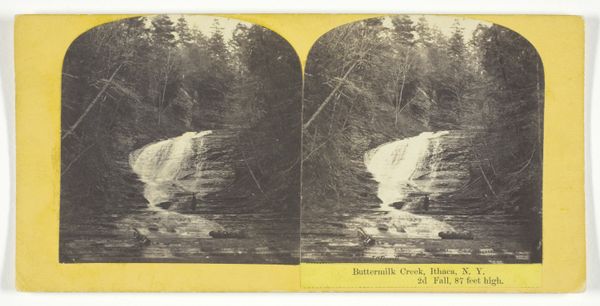 J.C. Burritt captured Buttermilk Creek in Ithaca, New York using photography, a relatively new medium at the time. This stereograph, with its double image on a card, invites viewers into a three-dimensional experience of the natural landscape. Photography’s rise in the 19th century was deeply intertwined with industrialization and expanding consumer culture. The process of creating photographs demanded a specific type of labor, from preparing the light-sensitive materials to developing and printing the final image. It democratized image-making, taking it out of the hands of highly trained artists and putting it within the reach of those who could master the chemical and mechanical processes involved. The popularity of stereographs speaks to this broader trend, providing mass-produced, accessible versions of scenic views that previously would only have been available through painting or printmaking. This image, then, not only presents a view of nature but also reflects the changing landscape of artistic production and consumption in an era defined by technological advancement.