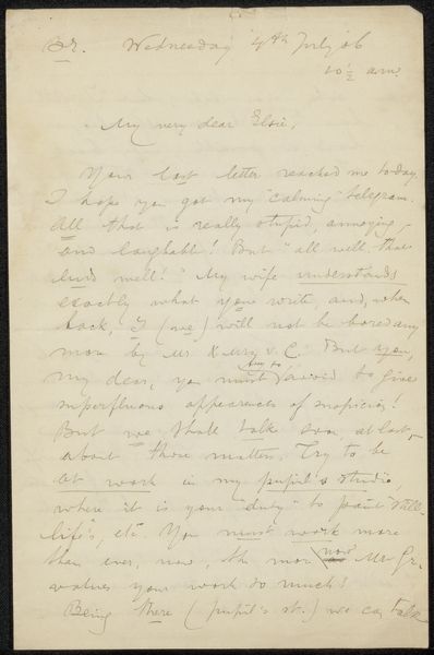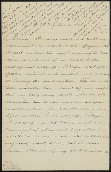 Curator: We're standing before a delicate sheet of paper holding Jan Veth's "Brief aan Pieter Haverkorn van Rijsewijk," likely from around 1900 to 1908. The artwork, a Rijksmuseum treasure, is rendered in pen and ink. Editor: The immediate impression is one of intimacy. A glimpse into a private thought. It's visually soft, due to the handwritten script and delicate lines. There’s an ephemeral quality about it. Curator: Absolutely, the ephemerality ties into it being a letter— a medium ripe with symbolism. Veth, known for his portraits, uses this letter to converse with Pieter Haverkorn van Rijsewijk, and though we do not know what it discusses, we do know that he was also an artist and writer. Editor: Thinking about letters as symbols, they represent a reaching out, a desire for connection. The act of writing, even more so back then, carries weight. Each stroke becomes a small monument to the relationship. There’s also an echo of vulnerability; revealing one's thoughts through writing always leaves a part of you exposed. Curator: Precisely! And knowing Veth’s dedication to capturing the essence of his subjects in his portraits, I wonder what kind of truth he sought to convey through his writing. Editor: The consistent and looping script gives an impression of unwavering intensity of feeling that can never be fully know but can be certainly felt! One may also think about how ink, as a substance, etches those sentiments permanently onto the page, solidifying thought into artifact. The visual language suggests more than mere information transfer, there is art and intention there as well. Curator: It seems to ask a lot from us viewers. We must project what is actually going on based purely on tone and overall sense that we may obtain. The text and the visual presence harmonize, but remain distant enough to provide interest in the tension between them. Editor: Exactly. As simple as it appears, this humble "Brief" holds so much for contemplation – a whisper across time about connection, vulnerability, and the power held within simple human expression.