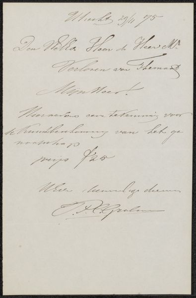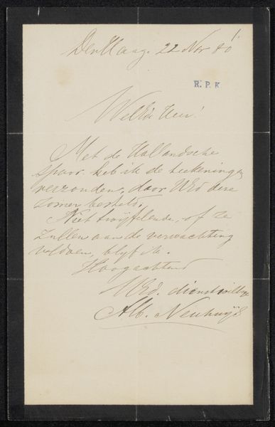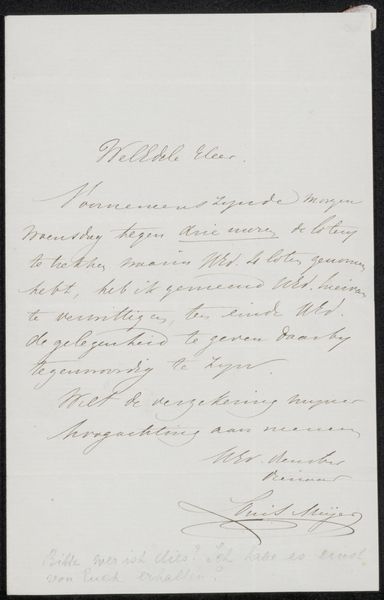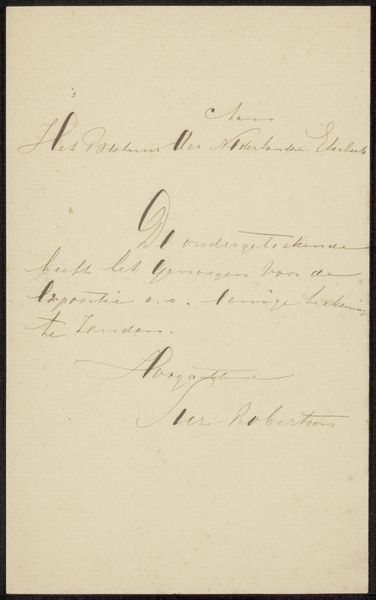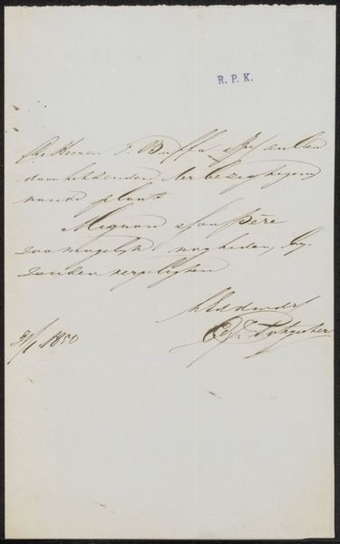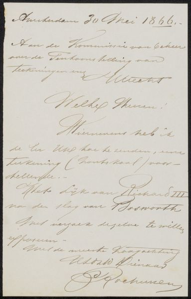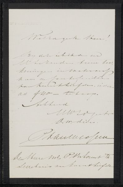 Curator: Here we have "Brief aan een tentoonstellingscommissie," which translates to "Letter to an Exhibition Committee," likely created around 1865 by Jan Lodewijk Jonxis. It’s currently held in the Rijksmuseum's collection. The piece uses ink on paper, demonstrating miniature calligraphy. Editor: My first thought? An invoice disguised as art! I love how delicate it looks, even with its very practical purpose, a subtle beauty to these mundane tasks. There’s a strange intimacy to seeing someone's handwriting from so long ago. Curator: Precisely! This is so much more than an invoice, of course. Consider calligraphy’s historical significance, particularly the elegant copperplate style, a script steeped in the cultural values of legibility and refined taste that were paramount at that time. Editor: And he's requesting what looks like 600 for "De Paardenmarkt"— "The Horse Market," probably a painting —and 400 for "Het Hondenest", a “Dog's Nest". Were dogs worth less than horses, even in art? Curator: That could be as much about relative size, perceived importance, or even labor involved. These weren’t casual sketches; they were considered investment pieces. In choosing a Horse Market scene versus, shall we say, a scene of a dog's nest might signify social aspirations reflected within a broader culture. The letter itself takes on ceremonial characteristics, acting as an extension of his cultural milieu, both intimate and historical. Editor: You know, seeing the price he assigned his paintings also makes him suddenly feel very human! Wonder if the committee thought he was being fair. There is a kind of quiet appeal. Almost like looking into a private conversation. Curator: Indeed, these documents invite speculation and help flesh out the character. By analyzing his penmanship—its flourishes and pressures—we tap into Jonxis’ psychological state and the broader attitudes towards art within his era. It prompts reflection on art history, the economics of artistic representation, and a cultural record contained in one note. Editor: Well, I will never look at an invoice the same way again, imagining now, like some strange symbol from a hidden history! Thanks! Curator: It highlights how everyday items reveal surprising stories when viewed through the lens of art.