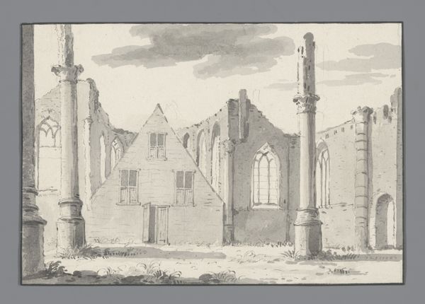 Hendrik Tavenier made this drawing of the church at Warmond and its ruins in pen and grey ink, sometime in the late 18th century. We see the church divided, the ruin to the left, and the church to the right. This division speaks to a period of great change, particularly in the role of the church in Dutch society. The economic and political structures were in flux, and institutions like the church were being challenged. Ruined architecture became a popular motif in art, perhaps reflecting the uncertainty of the times. To understand this work more fully, we can look at archival sources from the period, such as church records, political pamphlets, and economic reports, to shed light on the social and institutional forces at play during Tavenier's time. It's through this historical lens that we can truly appreciate the depth and complexity of this seemingly simple drawing.