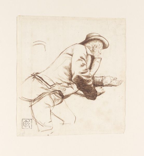 Editor: This is "Zagende man" by Jean Bernard, a drawing from 1826 at the Rijksmuseum. I'm struck by how ordinary the subject is – just a man sawing wood – yet there's a delicate quality to the line work that elevates it. How do you interpret this work? Curator: I see this drawing as a valuable document of its time. Consider the Romantic era in which it was created; there's an interest here not just in portraying the worker, but perhaps in idealizing labor, even as the Industrial Revolution began to reshape social structures. Note how the figure is rendered with careful attention to detail, despite the mundane activity. Who does this figure represent? Is it about glorifying labor, or is it a commentary on the changing social landscape of the time? Editor: That’s interesting. I hadn't thought about it in terms of idealizing labour. It almost romanticizes the individual worker, as if emphasizing the importance of skilled craftsmanship in an increasingly industrialized world. Curator: Precisely. And notice the details – the hat, the neatly stacked wood scraps. This is not presented as a scene of abject poverty. How do we reconcile this seemingly celebratory depiction with the realities faced by many laborers in the 19th century? Can we see an intention by the artist of underlining a social statement about the dignity of labour, or pointing out a potential source of tension? Editor: I hadn’t considered that potentially critical reading. So, by analyzing these details, we can start to understand the social and political contexts in which Bernard was working? Curator: Exactly. By understanding those contexts, we reveal the inherent power dynamics represented—or not—in this seemingly simple scene. What appears on the surface as a neutral depiction gains significance through that understanding. Editor: I see it so differently now. It is an insightful way to reflect on the dignity and socio-political context surrounding labour, and the romanticism of working during an era that sees industrial growth.