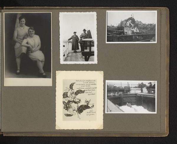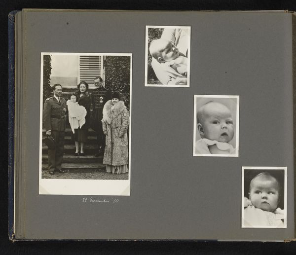 Editor: Here we have "Princess Juliana with the Princesses", a 1941 gelatin silver print. The album page holds intimate, personal photographs of Princess Juliana and her daughters in Canada during World War II. It has an air of longing to me. What symbols do you observe in these family portraits? Curator: Indeed. This is an emotionally resonant tableau, wouldn't you agree? The presence of these images within the album format itself acts as a powerful symbol – a carefully curated narrative of exile and resilience during wartime. Editor: So the family photos themselves symbolize resilience during exile? Curator: Precisely. Consider the conscious decision to capture and compile these moments of family life in a foreign land. Each photograph serves as a poignant reminder of home, of continuity amidst disruption. The recurring motif of childhood innocence, with the princesses at play, speaks to hope for the future and a longing for normalcy despite war-torn Netherlands. Doesn’t that strike you as purposeful? Editor: I see that. Their gestures are intimate: the Princess is looking at the camera with pride; in another photo she's at eye-level playing with her child. All meant to exude maternal joy. Curator: Precisely, consider too, the selection of images. Each carefully chosen photograph reinforces a narrative: Royalty in refuge, mothers cherishing their children. In these roles are deeply rooted symbolic connotations of hope. Does this compilation speak of national identity surviving through even dark periods? Editor: Absolutely. Now that you mention the narrative, these photos transform from mere family snaps into a testament to a nation's spirit in exile. Thanks, I hadn't considered all of the symbolic layers. Curator: My pleasure! Consider, too, what we've explored together the next time you examine portraiture from fraught periods.