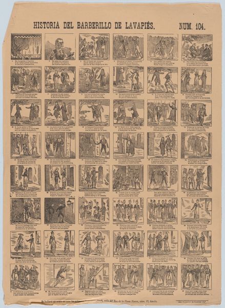 This broadside, created in Barcelona in 1861 by José Noguera, is a printed sheet of paper, a relatively inexpensive medium even then. It's covered with 48 scenes depicting the misadventures of a shoemaker's apprentice. The printing process itself is key here. This wasn't a unique work of art but was made for mass distribution. The scenes, rendered with simple lines, would have been etched into a metal plate, inked, and then pressed onto the paper. Each sheet, identical to the last, would have been sold cheaply on the streets. The very nature of printmaking made this kind of social commentary possible. It speaks volumes about the lives of working-class people. The young apprentice, presumably trapped in a system of labor with little opportunity, finds his release in mischievous acts. It makes you wonder about the artist's own social standing, and whether he, too, felt trapped in the gears of production. This broadside reminds us that even the humblest materials can carry powerful social messages, blurring the lines between art, craft, and political commentary.