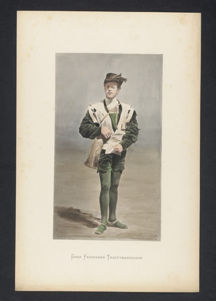 This is a portrait of Hector von Baltazzi, created with what appears to be watercolor, by an anonymous artist. The composition presents Baltazzi standing in what seems to be the countryside. The artist has meticulously crafted a symmetrical, centered composition. Baltazzi is adorned in an ensemble of green, gold and white hues, holding what could be a bow, which creates a striking contrast against the muted backdrop. The formal elements invite contemplation on identity and representation, using Baltazzi’s attire to convey meaning. The artist has employed a traditional visual language, perhaps to reinforce Baltazzi’s position within a specific social hierarchy. Consider how the artist’s choices function within the broader context of portraiture. The painting is not merely a depiction but a carefully constructed representation, inviting us to question the semiotic signs embedded within the artwork. It encourages us to explore the cultural codes that informed its creation and reception.