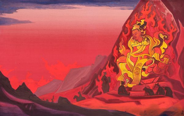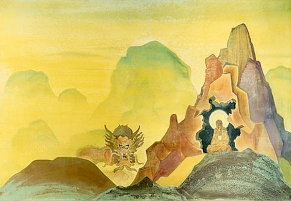 Nicholas Roerich painted Nagarjuna, Conqueror of the Serpent, with what looks like tempera, probably sometime in the first half of the 20th century. It’s got this amazing, dreamlike quality; mountains and water in shades of purple and grey kind of dissolve into each other. I love how Roerich builds up the image with these simple, almost geometric shapes. The paint looks really thin, washy, like he's staining the canvas rather than covering it. And that snake, coiled around the central form, is like a golden thread connecting the earth to the heavens. Look at the way the pink clouds echo the form of the mountains below. It’s like Roerich is showing us how everything is connected, how the spiritual and the material are just different sides of the same coin. It reminds me of Hilma af Klint, another artist who was exploring these kinds of esoteric ideas through abstract forms. There’s something so open and ambiguous about this painting; it's a reminder that art is a journey, not a destination.