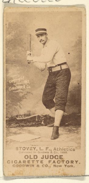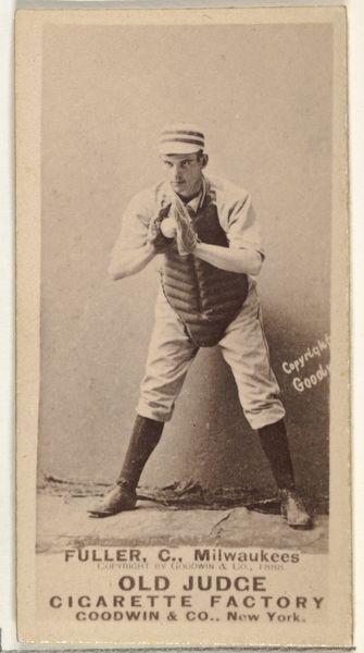 Editor: This is "John Sowders, Pitcher, Kansas City Cowboys," a photographic print from 1888, part of the Old Judge Cigarettes series. It's amazing to see such an early baseball card! I’m struck by the contrast between the posed formality and the dynamism you’d expect from an athlete. What strikes you when you look at it? Curator: What stands out is its placement in a rapidly industrializing America. Produced for a cigarette company, this image reveals how sport, commerce, and masculine identity were intertwined. The 'Old Judge' series highlights the commercial exploitation of athletes, but let's also consider how these images might have empowered players, granting them a new form of visibility. Who benefited most from this type of imagery, and at whose expense? Editor: That’s a perspective I hadn’t considered. So, beyond just being a baseball card, it reflects a specific moment in labor history and celebrity culture? Curator: Precisely! Consider how mass-produced images also shape public perception and collective memory. This photograph isn't just about John Sowders; it's about constructing a certain kind of American hero, a certain ideal of masculinity linked to consumerism. Were all athletes of the time equally represented in this kind of imagery? Who was excluded and why? Editor: I see what you mean. It makes you think about who gets to be remembered and how, based on commercial interests and social power. I will never look at sports memorabilia in the same way! Curator: That's the goal. To view objects as products of social, economic, and political forces – to excavate the layers of meaning embedded within them. Editor: Thanks, this really reframed my understanding!