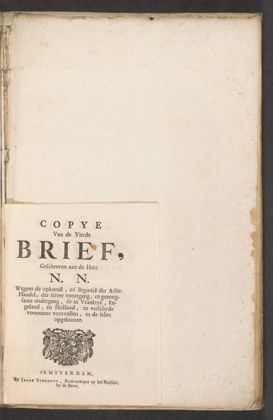 This printed letter, published in Amsterdam in 1720 by Isaac Stokmans, exposes the deceit of newly established companies. Note the crest, a bouquet of flowers, prominently displayed between two ribbons. This symbol, though seemingly innocuous, echoes the ancient motif of the cornucopia or horn of plenty. In antiquity, it represented abundance and prosperity, often associated with deities like Fortuna. Yet, here, amidst the speculative frenzy of the early 18th century, its presence is laced with irony. It evokes the allure of limitless wealth, while the text warns of the “downfall” of companies in France, England, and Holland. The visual language taps into a collective memory of prosperity, even as the letter's content challenges the very notion. The choice of this familiar symbol, now tainted with deception, reveals the potent psychological dance between hope and fear during a period of economic uncertainty. The cornucopia, a recurring emblem in art history, is here reborn as a cautionary emblem of speculative greed.