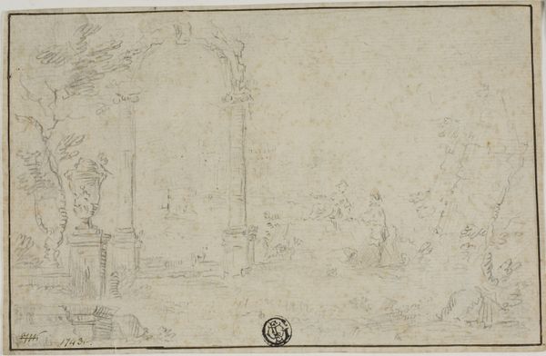 Curator: Welcome. Here we have a drawing entitled "A Party in a Roman Villa," attributed to Pirro Ligorio. The medium is ink. What are your first thoughts? Editor: It feels frenetic, a whirlwind of activity barely contained on the page. There's a sense of revelry, almost chaotic, but rendered with such delicate lines that it’s surprisingly gentle. Curator: Ligorio was a fascinating figure, a scholar and architect deeply invested in Roman antiquity. We see that here in his meticulous, though somewhat imaginative, reconstruction of a Roman villa, a space he conceived as central to social and political life. Editor: The architecture definitely feels like a stage. The figures, engaged in various acts of leisure—dancing, embracing, lounging—seem to be performing their roles within this constructed Roman ideal. I am interested in the hierarchy that is created, where some people are dancing together and others are left laying about. Curator: Exactly! Think about the patrons for whom Ligorio worked, often cardinals or other members of the elite. The drawing may reflect their aspirations, their desire to connect themselves to the grandeur of Rome, framing it as an extension of their own power and social standing. Editor: But at what cost? While there's beauty here, I also see a sort of curated escapism, an idealized fantasy built on very real, often brutal, historical foundations. Rome, after all, was built on conquest and slavery, a historical backdrop usually conveniently absent in these idyllic scenes. It’s hard for me to fully embrace the fantasy. Curator: I agree. There's a tension, isn't there? We see the visual splendor and are also prodded to think about the broader socio-political context. Ligorio’s work is a reminder that art often functions as a reflection of power, carefully constructing narratives that both reveal and conceal. Editor: It does make you wonder about who had the privilege to participate in the "party," and whose labor allowed for such leisure. Art provides a lens, sometimes a rose-colored one, through which to critically examine the power structures of past and present. Curator: Precisely. Thank you for that perspective. I believe this artwork encourages us to continuously investigate art's multiple facets and to question its role within historical and present-day society. Editor: Yes, to keep interrogating the narratives embedded in the art that shapes our understandings. Thanks.