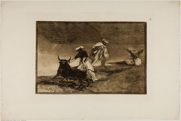 Editor: This print, "A Spanish Knight Kills the Bull After Having Lost the Horse" by Francisco José de Goya y Lucientes, is intense. What emotional narratives do you see unfolding here? Curator: The figure of the knight, still enacting his ritual even after losing his horse, speaks volumes. Notice how Goya uses the visual language of bullfighting, which itself is steeped in symbolism? Editor: It’s like a dance with death, but off-kilter. What does it mean when the expected order is disrupted? Curator: Exactly. The knight's determination, set against the fallen horse, reveals a primal battle, reflecting themes of mortality and the human spirit's persistence. The symbols resonate across time. Editor: So, it’s about more than just a bullfight; it's a meditation on perseverance. Curator: Precisely! And Goya challenges us to confront what we inherit and how we react when traditions crumble. Editor: That gives me a lot to consider. Thanks! Curator: My pleasure. I hope it sparks new ideas!