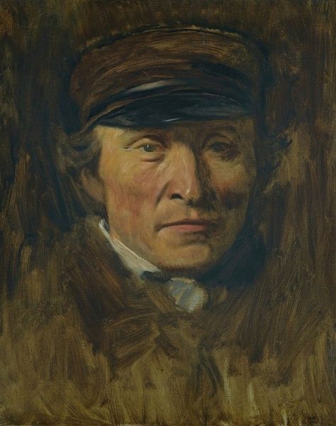 Editor: Here we have Albert Edelfelt's "Karelian Without an Eye," an oil painting from 1879. It's a striking portrait. The man's face is incredibly weathered, and the missing eye adds a raw vulnerability. What's your take on this piece? Curator: From a materialist perspective, consider the very act of its production. Edelfelt used oil paint, a readily available but relatively costly material at the time, pointing to the professionalization of art and the commodification of images. The brushstrokes themselves are quite visible, raw and unblended. What does that choice convey about the representation of labor, or perhaps, of masculinity? Editor: It makes him seem rough, certainly not idealized in any way. Do you think that the 'realism' sought to portray everyday people rather than an idealized upper class? Curator: Precisely. And realism has roots in social consciousness. How does representing a working-class Karelian man – a specific regional identity, further marked by disability – challenge the art market of the late 19th century? It forces a confrontation with the realities of labor and societal inequalities that were conveniently ignored. Think about what goes into acquiring the raw materials. Editor: The canvas, the pigments... there's labor involved at every step, beyond just Edelfelt's artistic work. It's like a record of physical work ingrained within the portrait. Curator: Exactly. Every layer, every visible brushstroke tells a story of both the subject and the artist's physical interaction with their materials. This intertwining is crucial for understanding how social relations are manifested in material forms. The availability and cost of oil paints shape his art making as much as his style. Editor: I hadn't thought about it that way before, viewing it as a cultural record with socio-economic underpinnings, thank you for sharing! Curator: It shows how artwork is enmeshed within complex and shifting cultural currents; focusing on its physical attributes can provide rich socio-cultural commentary!