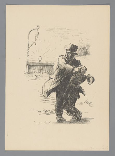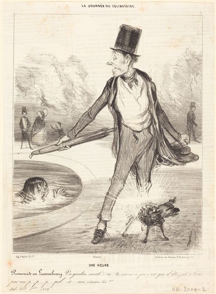 This lithograph by Honoré Daumier presents a scene rendered in shades of grey, dominated by the looming figure of a bourgeois man. His dark coat and top hat sharply contrast with the field of wheat, where another hat lies next to a body. Daumier masterfully uses line and shadow to create a sense of depth and unease. The composition is carefully structured, guiding the eye from the upright man to the body below. This stark juxtaposition invites us to question the values and ethics of the bourgeoisie. The lithographic medium, with its capacity for nuanced tones, enhances the somber mood. Daumier's focus on form and structure is not merely aesthetic; it's a critique. The visual arrangement serves to highlight the social inequalities of his time, using semiotics to interpret the cultural codes and power structures at play. The artwork does not offer a fixed meaning but instead destabilizes assumptions about class and compassion.