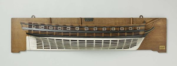 Curator: What strikes you immediately about this "Half Model of a 68-Gun Ship of the Line," circa 1797-1798? It’s a fascinating object. Editor: It's incredibly austere, almost diagrammatic. The contrasting dark hull and the white lines of the frame—they speak of a blueprint more than a vessel. What can you tell us about this wooden artifact? Curator: Well, these "half models," as they’re called, served as prototypes. Artisans would craft one side of a ship’s hull to determine the lines for its construction. They are essentially templates that embodied centuries of accumulated maritime knowledge and symbology. The ship has been a potent symbol for exploration, trade, and conquest. Editor: Right. And to see this level of planning laid bare in wood speaks volumes about the labor, craft, and investment of resources required for these massive undertakings. Think of the sawyers, the carvers, the blacksmiths – entire economies geared toward shipbuilding. The model highlights process. I am interested in understanding who created it, for what purposes? Curator: Precisely. The symmetry, and that lack of overt embellishment invite you to consider it as the physical manifestation of maritime authority, order, and power. The individual components combine towards that ultimate symbolic objective. Editor: Absolutely, but for me the visual precision belies all the invisible work, not of the mind, or concept, but of human hands involved in such enterprises. One can almost imagine the workshop setting from seeing its stripped-down structural elements here! It feels oddly modern, perhaps because of this brutal honesty in materiality. Curator: That contrast works so well. Now I also find it’s a testament to the universal aspirations of any age, from discovery to dominion. Editor: Seeing it broken down like this really does ground it, yes. We begin to glimpse a vision for new frontiers or violent naval operations and more through considering all this hard work to complete construction and production, centuries on!