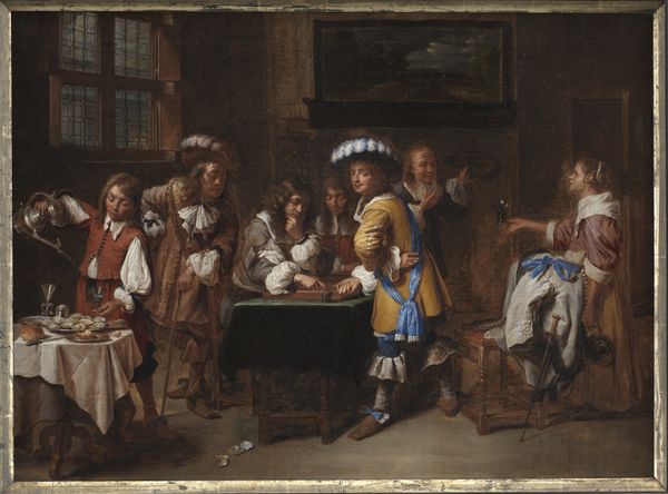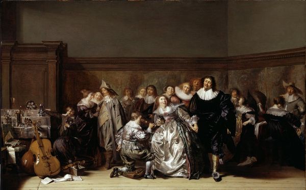 Curator: This is "Merry Company in a Room" painted in 1633 by Anthonie Palamedesz. It’s an oil on canvas, showcasing a lively gathering of figures indoors. Editor: It strikes me as…carefully arranged. Everyone is so deliberately placed; the light is bright, and the figures, though in revelry, seem quite posed. What’s your take? Curator: Well, it’s a classic example of a "geselschap" or "merry company" scene popular in the Dutch Golden Age. These paintings reflected the values and social behaviors of the rising merchant class. A display of prosperity. Editor: Ah, prosperity manifested! I notice the way the light glints off the glassware and the elaborate textiles. The crafting of the image emphasizes luxury. Even the dog looks well-fed. Did the painter focus specifically on interior scenes like this? Curator: Yes, Palamedesz. specialized in these genre scenes and group portraits. He captured the nuances of social life, reflecting on the performative aspect of class. Note also the paintings on the back wall, these interiors existed as a space for consuming more artwork! Editor: Interesting. The detail put into the rendering of their clothing points to an obsession with materials, fabrics and adornment, perhaps exceeding the characterization of individual people. Look at the gentleman slumped in his chair. I wonder if this work speaks more to a broader trend in art than to a study of an isolated population sample. Curator: That’s insightful. He and others contributed to establishing codes and visual tropes through such popular works. What is depicted reflects both ideals and a self-awareness within this societal echelon. Editor: The artifice feels like the point. Everything on display for a specific purpose. And if art serves the wealthy class of people, is there something lost in its messaging to other classes? I’m just left with a curious aftertaste… a certain calculated frivolity? Curator: These glimpses into history definitely offer food for thought. Seeing the choices, commissions, and artistic interpretations is always enlightening in understanding a culture’s values. Editor: Indeed. It pushes us to think more critically about the interplay between craftsmanship, consumption, and the shaping of history, whether painted or woven.