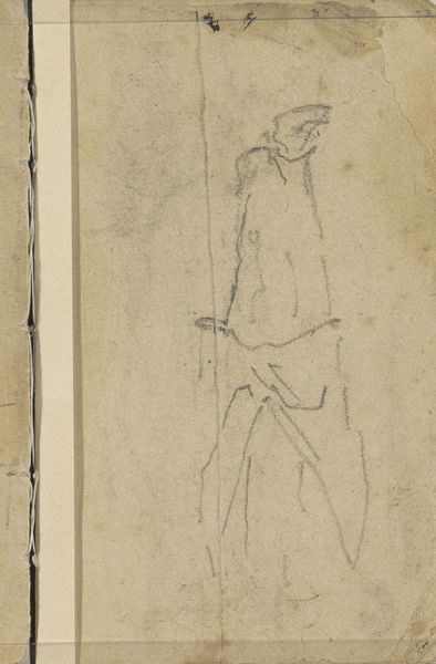 Editor: This is "Standing Man and a Bridge" sketched by George Hendrik Breitner between 1880 and 1882. It's a simple pencil drawing, looks like something straight out of the artist’s sketchbook. It feels so raw and immediate. What strikes you about this piece? Curator: Raw is the perfect word. I think Breitner's brilliance lies in capturing these fleeting, unpolished moments. There’s an energy here, a realness that’s almost intrusive, don't you think? I see the start of something great. A possible study, maybe? Like a snapshot of everyday life from a century-and-a-half ago that wouldn’t look out of place in the streets today! Editor: Absolutely. There is a timeless feel to it. So it wasn’t intended as a formal portrait? Curator: I doubt it. The very nature of it – a quickly jotted down observation rather than a polished depiction. But there is a captivating authenticity. It's almost as if Breitner's allowing us a peek into his personal visual diary! Are you noticing a sense of motion and transience in this composition, or is that just me? Editor: Now that you mention it, yes! Especially with the bridge, how it's only partially formed and dissolving in space… And the man himself looks caught in mid-stride. Curator: See! I think this captures a moment of observation of ordinary existence. A slice of Dutch life through an Impressionistic lens, if you will. What a glorious find, right? It just reveals the profound beauty that lies within the ordinary. Editor: It's wonderful how something so simple can speak volumes. Thanks for helping me look beyond the sketch. Curator: My pleasure entirely! And isn't it lovely how art continues to spark curiosity. Keep exploring, keep questioning. You never know what you'll uncover!