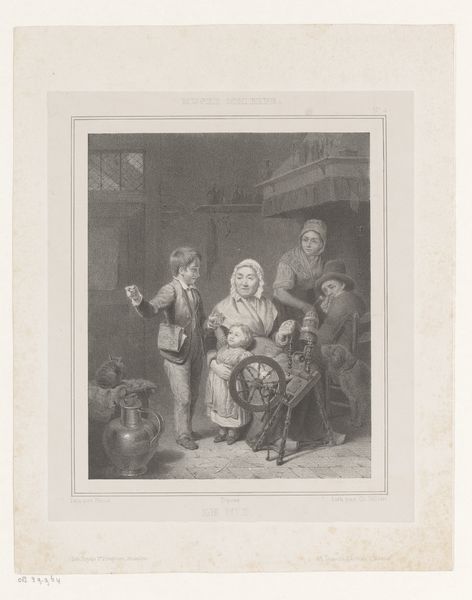 Editor: This engraving, "Interior with Mourning Family," created in 1841 by Franciscus Bernardus Waanders, depicts a poignant scene. The heavy use of shading casts a melancholic shadow over the entire composition, making the lone soldier seem both central and isolated. What narrative do you unravel when you look at it? Curator: Narrative is exactly the right word. It reminds me a little of those melodramatic history paintings. Consider the rigid pose of the soldier and the dramatic grief of the family. Look closely at their gestures; how theatrical they are! But unlike history painting, it's got this everyday realism... as if the artist tried to record an ordinary, painful moment. And those scattered papers on the floor... almost like fragments of untold stories. Do you see any symbolism you recognize? Editor: Hmm, not explicitly. Perhaps the soldier leaning against the doorframe suggests a fragile barrier between safety and war? Or am I projecting a bit too much? Curator: No, projection is half the fun! It's a dance, really. We're invited to ponder about absence and presence, about duty and family. It invites introspection; this somber room is also the theatre of our own emotions. Editor: I hadn't thought of it that way. It’s as if Waanders used realism to draw us in and romanticism to heighten the emotion. Curator: Precisely. Perhaps to allow us to see into our own hidden selves. Editor: So, maybe this engraving reflects universal themes of loss and the human condition after all. I’ll never look at a black and white image the same way.
