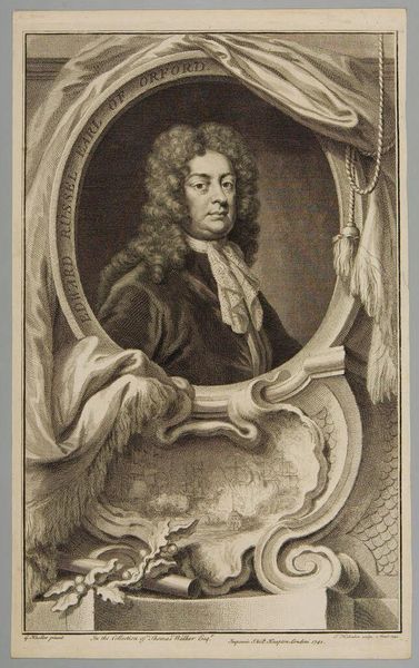 Editor: Here we have Jacobus Houbraken's print of Sir William Wyndham. The textures are so meticulously rendered. What is your perspective on the visual construction of this portrait? Curator: Indeed. Note the artist's skillful use of line and stipple to create tonal variations and textures, particularly in the wig and drapery. The oval frame, combined with the subject's gaze, creates a structured yet engaging composition. Do you observe how the objects at the bottom balance the portrait? Editor: Yes, the arrangement feels deliberate and balanced, almost geometric. I appreciate how the formal composition adds to the imposing feel of the portrait. Curator: Precisely. The balance is essential for creating a portrait of such dignity and power. The artist's attention to the formal elements communicates Wyndham’s social standing. Editor: I see that. Thanks, I didn't notice the balance before. Curator: My pleasure.