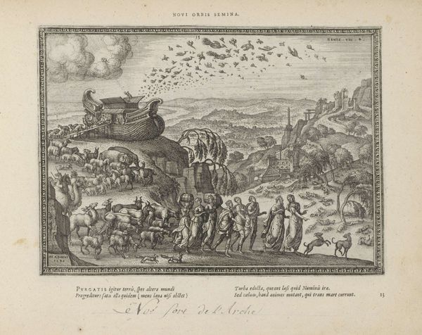 Curator: What a busy scene. Immediately, I see riders, livestock, ships on water. This must be a bustling location of some significance to render the piece this way. Editor: It has a quiet energy for such an elaborate scene. There is such a dreamy softness to it. A peaceful landscape on water makes me feel calm just by seeing it. Curator: Indeed. What you are viewing is titled "Gezicht op Lerici, 1726", translating to "View of Lerici, 1726." It’s an engraving, printed from an incised metal plate. The print offers a view of the Italian coastal town, capturing the port with figures traveling the road and ships docking at its harbor. Editor: Wow. Metal?! And it’s this detailed? Look at how they rendered clouds. It’s incredible. Are there people up there, on those clouds? The ships have so much detail...how long would something like that take? Curator: Well, there's certainly an intensive process to this creation that has taken its time! Engravings like this required highly skilled labor, each mark carefully incised into the metal, probably copper. The multiple stages, proofing, editioning - it shows the commitment in reproductive printmaking in early modern Europe. And, yes, there are figures riding those clouds. Symbolic elements were commonly added in history-themed engravings and paintings to indicate more significance and impact for viewers, and possibly offer further artistic expression from the artist who engraved the plate. Editor: History theme. Like a painting but with the multiple ability because it's engraving and a print. This engraving makes me wonder about all the unseen hands. Like the ink maker, paper presser...and where does the metal come from, anyway? Fascinating! Thank you for that background! Curator: You are welcome! It really brings perspective on the context and craftsmanship in which this was made. I find these visual reminders to be an exercise in understanding history through object. Editor: It definitely opens one up to the layers. I have new appreciation for the artistry, labor, and social world surrounding “Gezicht op Lerici."