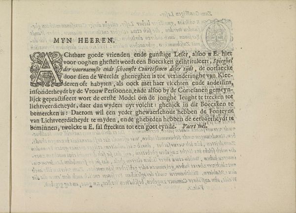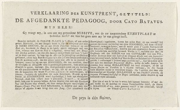 Editor: This piece, "Tekst bij het portret van Maria Louisa van Hessen-Kassel," likely from 1751, is currently housed at the Rijksmuseum. The print, employing techniques of engraving and typography, has such elaborate textual elements and almost seems more textile-like in the intricacy of its pattern-making! Initially, I am struck by how verbose and dense the composition is. What do you see in this piece? Curator: Ah, yes, it’s quite the textual tapestry, isn’t it? To me, this isn’t merely typography, it is a symphony of symbols and sentiments. Each word is a carefully chosen note. It speaks volumes about the values of the time, of course – a time steeped in ornate expression. The baroque period embraced layering, flourish, and detail as an act of love and devotion. Do you pick up on the… drama of it all? Editor: I see the detail in the piece, sure, but where exactly do you find its dramatic expression? Curator: Oh, look closer! It’s not just a description of Maria Louisa, but a performance of her virtue! It mourns loss while simultaneously trumpeting hope. A widowed queen; the embodiment of steadfastness; divine guidance in times of upheaval. I feel as though I've stepped into a play with her at its emotional heart. It mirrors back the cultural obsession with moral storytelling during that era. Don’t you just love how history whispers through these etchings? Editor: Now that you mention it, the descriptions are quite florid! It feels less like objective historical record, and more like... advertising copy. The mention of the widowed queen's “lustrous son” certainly lends to that idea. I will say that, after having spoken with you, I find myself more drawn into its layered complexity. Curator: Indeed! A glorious conclusion. Perhaps a bit of what we need more of today: celebrating our own virtues, both obvious and obscure!