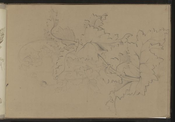 Editor: This drawing, titled "Landschap" and created by Johannes Tavenraat sometime between 1839 and 1872, is currently housed in the Rijksmuseum. It's a pencil drawing, quite light in its rendering, that feels almost like a fleeting memory of a landscape. What do you see in this piece? Curator: The beauty of this piece lies precisely in its structural fragility. Notice how Tavenraat employs a network of delicate lines to define the spatial relationships. There's no commitment to mass or volume; instead, we see a focus on delineating edges and contours. What do you make of the distribution of the marks themselves? Editor: Well, they seem concentrated in areas that I assume are meant to represent foliage or maybe rock formations, while other areas are left almost entirely blank. It's creating a contrast between dense, active marks and areas of negative space. Is that contrast significant? Curator: Indeed. The juxtaposition calls attention to the materiality of the drawing itself. It ceases to be merely a representation and becomes an object of contemplation. Notice the linear inscriptions across the picture, almost notations on texture. Are they incorporated as elements of visual design, or as objective labels for external data capture? Editor: Now that you mention it, it seems he uses handwriting and line work to create a very integrated structure where the boundary between objective note-taking and the creation of aesthetic qualities gets really blurred. I also noticed he doesn't erase many lines, and you can trace several attempts at creating contours or shadows. That honesty is part of what makes this landscape so interesting. Curator: Precisely! Tavenraat's drawing is an exercise in the poetics of form and process. Editor: Thanks! Thinking about the structural choices definitely made me appreciate aspects I might have missed focusing on the depicted landscape itself.