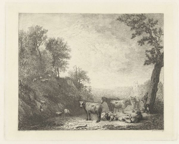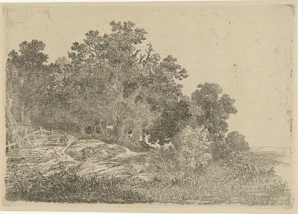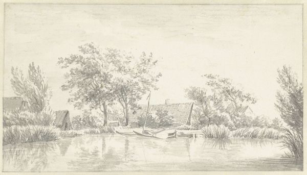 Curator: Here we have Remigius Adrianus Haanen's "Boerderij bij een bruggetje", or "Farm by a Little Bridge," created in 1849. It’s a delicate pencil drawing, exhibiting a strong sense of realism and a nod towards the Dutch Golden Age landscape tradition. What strikes you initially about this piece? Editor: It feels…peaceful. There’s a certain stillness to the scene despite the intricate detail. The smallness of the figures emphasizes their connection with this abundant natural setting. It seems to suggest themes around peasantry and the simple joys of country living, which, given the historical context, can also raise complex social questions of land ownership and rural exploitation. Curator: Absolutely. And looking at Haanen's technique, the varied densities of the pencil work are impressive, building textures and creating a tactile experience. I'm interested in the accessibility of pencil as a medium in representing landscape. He isn’t just rendering what he sees; he's engaging in a labor-intensive process. Each line and shadow requires time, focus, even a certain type of physical engagement. The consumption of paper and pencils as tools themselves in 1849 has meaning, representing forms of literacy and expressions affordable to some demographics more than others. Editor: I agree. I'm struck by the absence of clear hierarchy. The bridge isn't just a bridge; it's a connector, blurring lines between nature and the made environment. And this attention to detail makes me think about what isn't shown, as much as what is: for instance, are these happy, laboring people free, or are they subjects of a social system in which the ruling class dominates, while reaping its financial rewards and privileges from an agricultural working class. Is it romanticization? I also think of it as something radical within art: foregrounding a demographic too long denied fair economic advantages. Curator: I see what you mean. Haanen’s piece provides a subtle challenge to what constituted 'high art' at the time by focusing on the material reality of the Dutch countryside and labor connected to that terrain, which also then challenges us now to engage actively in the cultural narratives they construct about that era. It brings up ideas about access, affordability, social realism versus idealization. Editor: Precisely. It invites critical thought not only on the construction of images but also on historical inequities still alive in art and society. And if we are prepared, perhaps Haanen offers us ways to reflect on where this realism begins, or should begin to end. Curator: Well, looking closely at the physical work, with its layers of mark-making, is one way we might begin. Editor: Indeed. Art, like the simple act of crossing a bridge, involves continuous negotiation—historical, social, and aesthetic.