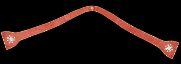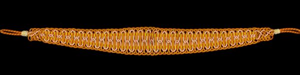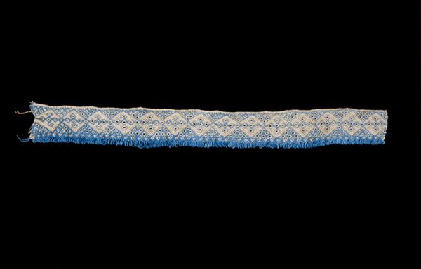 Editor: This is "Trim," an anonymous textile piece from the 19th century. The decorative geometric pattern really grabs my attention, it almost looks like an elegant, deconstructed chain. What strikes you about its visual construction? Curator: The strength of this piece resides within its systematic repetition of form. Notice how the artist organizes semi-circular shapes and short vertical lines into this linear design. This controlled structure creates a rhythm; its optical integrity depends upon our recognition of this ordered schema. How does this structured approach to embellishment impact your understanding of the work? Editor: Well, knowing that the focus is the geometric rhythm, I find my eyes keep wanting to trace the line. Does the background colour interact with how we read that central trim? Curator: Precisely. The negative space created by the stark black background does more than frame the Trim: the field’s somber tonality forces a figure-ground relationship, isolating our embellished focal point, enabling us to examine the properties of shape. Editor: That makes perfect sense. The visual components really come together as a focus on that repetitive element, allowing us to truly examine what makes the trimming visually interesting and balanced. Curator: Indeed, and through the repetitive construction of the medium, a dialogue begins about what significance lies within that linear and ordered scheme. Editor: This has given me a lot to think about, looking at the piece as less about function and more about the structural dialogue the artist has built.