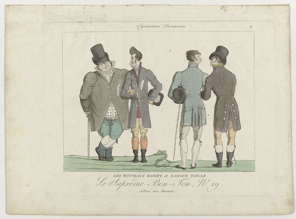 Editor: Here we have John Doyle's lithograph, "Voor het kantoor van Robert Peel," likely created between 1844 and 1848. The figures, particularly their elongated bodies and expressive faces, have a rather striking quality to them. It seems to depict social commentary in a humorous way. What do you see in this piece? Curator: From a formal perspective, the stark contrast between light and shadow, achieved through lithography, serves to heighten the caricature. Notice how the artist uses line to define form and expression. The composition itself, with the three figures separated in distinct spatial planes, directs the eye, almost like a stage setting. What effect does that staging have on your reading? Editor: I suppose the division focuses each figure, accentuating their individual reactions or circumstances. Curator: Precisely. It invites close analysis of the posture and gaze of each character, essentially fracturing the narrative into distinct moments, while still implying a cohesive social reality. This strategic use of space and light creates visual interest, highlighting a story with careful formal arrangements. The stark lines almost read as boundaries. What boundaries do you interpret? Editor: That's a great point. There are boundaries of class. The registry office itself is a formal divider of people who seek work and people who can offer employment. I learned a lot about seeing social class through a structuralist lens, thank you! Curator: And I was reminded of how the lithographic medium and compositional design intertwine to convey nuanced social commentaries through visual cues.