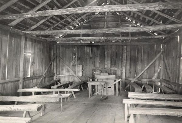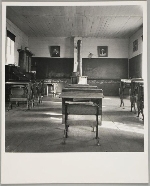 Editor: Dorothea Lange's "Untitled (country church interior)" captures an austere, wooden church interior. The light filtering through the windows creates a somber mood. What can you tell us about this photograph? Curator: Consider the context of Lange’s work, often focused on rural poverty and labor during the Depression. The starkness of the church, the simple wooden construction, the visible wear—these elements speak to the material conditions of the community. How does the placement of the stove in the foreground influence your understanding of the space and its inhabitants? Editor: I see how the stove might represent the community's struggle to maintain warmth and comfort amidst hardship. It’s a very grounded perspective. Curator: Exactly. By focusing on these tangible aspects, we move beyond the purely spiritual interpretation and consider the church as a site of both devotion and material reality. This gives us a better picture of the social realities of the time. Editor: That’s a helpful way to look at it, thank you!
