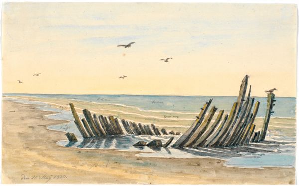 Curator: This watercolor by Martinus Rørbye, titled "From Gærum Hills in Vendsyssel, 22nd May 1833", offers a glimpse into the Danish landscape through a Romantic lens. It’s quite evocative. Editor: It is. The muted palette and almost severe horizontality give me a sense of quiet stoicism, even melancholy. Look at those shadows, though, sharp and directional – they suggest something solid, unyielding. Curator: Absolutely. Rørbye masterfully balances the ethereal quality of watercolor with the grounding weight of these geological forms. Note how he uses color washes to create atmospheric perspective, the distant land fading into the horizon. It demonstrates the picturesque conventions typical of the Romantic period. Editor: I see the formal structure you point out, but those large boulders are almost primal symbols themselves. These could be Dolmens, megalithic monuments scattered across Denmark, imbued with cultural memory and ancestor reverence. The scene, at first glance merely a landscape, transforms into a repository of meaning and collective experience. Curator: An interesting proposition. You see the stones as active bearers of symbolism, I am instead interested in the overall effect. It evokes a palpable feeling of openness – a connection between the viewer and the vastness of the Danish countryside. I am also intrigued by the composition itself; the perspective and the layering of planes add to its atmospheric depth. Editor: But that atmosphere itself isn’t just meteorological. There’s a quiet solemnity present, even beyond the overt references to national Romanticism. What’s hidden? What meanings might be lodged, petrified within those stones? Curator: Well, regardless of hidden meanings, it serves as a powerful exercise in visual poetics. Editor: Yes, a poignant record, leaving us with unresolved quietude. Curator: Precisely. Rørbye’s work encapsulates so many aesthetic preoccupations in such a simple view.