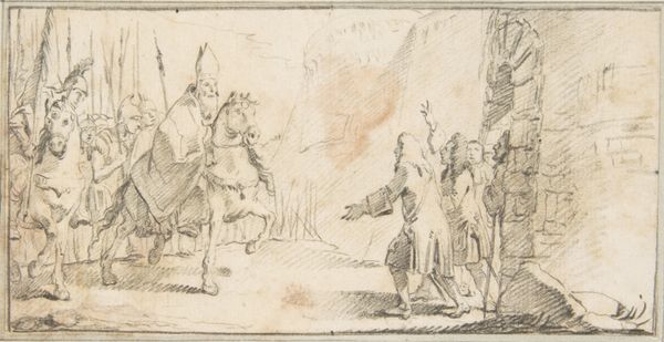 This is an illustration made by Giovanni Battista Tiepolo, likely in the mid-18th century, using pen and brown wash on paper. The sketch presents a scene with a cardinal greeting a general at a city gate, composed with dynamic lines and a clear separation between the welcoming party and the approaching military figure. Tiepolo's use of line is particularly striking here. Notice how he employs quick, energetic strokes to define the figures and architecture, giving the scene a sense of immediacy and movement. The composition is structured to lead the eye from the left, with the general on horseback, towards the right, where the cardinal and his entourage await. This directional flow is reinforced by the contrast in light and shadow, which adds depth and drama to the scene. The architectural elements, especially the gate, are rendered with a loose yet precise hand, reflecting Tiepolo's mastery of perspective and spatial arrangement. The relatively monochrome palette emphasizes the formal qualities of line and tone, inviting us to consider how these elements structure our reading of power and ceremony within the depicted encounter. This work serves not just as a narrative illustration, but as a study in form and composition that destabilizes any fixed meaning.