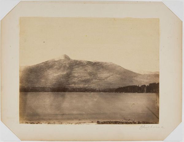 Editor: Here we have William Henry Jackson's "Mystic Lake, Montana." The sepia tones give the landscape an ethereal quality. What symbols or imagery do you notice in this piece? Curator: The lake acts as a mirror, doesn't it? Reflecting the mountains evokes a sense of doubling, a mirroring of the conscious and unconscious. It invites contemplation of nature's symbolic power. Editor: That's a fascinating point! Curator: The lone figure by the lake could represent humanity's small place within the grandeur of the natural world, highlighting a search for meaning. What do you make of the oval framing? Editor: I didn't think of that. The framing adds to the dreamlike quality. Thanks! Curator: Indeed. The photograph invites us to consider nature as a symbol of inner reflection and existential questioning.