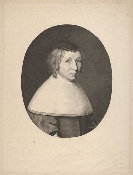 Editor: Here we have Robert Nanteuil's portrait of Madame Bouthillier. The detail is incredible, but there is also a formality that seems so distant from our modern world. What do you make of this piece? Curator: It whispers of powdered wigs and secrets shared in hushed tones, don’t you think? The formality is palpable. Nanteuil captures her, not just as a likeness, but as a statement of power, perhaps even a touch of melancholy. The question is, what secrets does Madame Bouthillier hold within that gaze? Editor: That's such a great question! I love imagining the stories behind these formal portraits. Thanks for your insight. Curator: My pleasure! Perhaps we should invent some scandalous tales for her, just for fun.