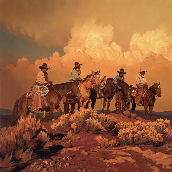 Mark Maggiori painted ‘Purple Haze’ with oils to capture a scene of cowboys on horseback. The horse itself, noble and steadfast, has been a symbol of power and freedom across cultures. We see it in ancient Greek equestrian statues, emblems of Roman authority, and here, as a companion of the American West. Their bond represents a harmony between man and nature, a theme echoed through time. Consider how horses in Renaissance paintings elevated rulers, while here they symbolize the untamed spirit of the frontier. The vast landscape, painted with an almost dreamlike quality, is a powerful force, engaging viewers on a deep, subconscious level. The motifs are cyclical and non-linear, resurfacing, evolving, and taking on new meanings in different historical contexts.
