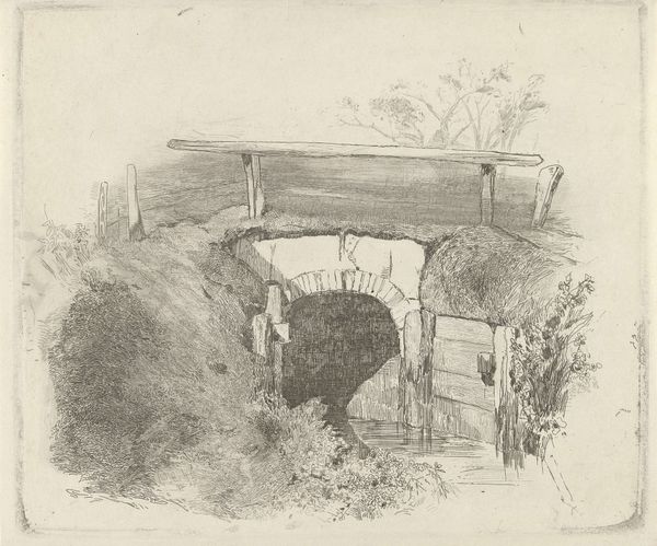 Editor: This is “Brug,” a pencil and ink drawing made in 1842 by Charles Rochussen, here at the Rijksmuseum. It’s a scene of a little bridge and figures. I find it fascinating how much depth he creates with what looks like such quick, spontaneous marks. What stands out to you in this work? Curator: Well, doesn’t it just breathe the very air of Romanticism, even though it’s infused with realism, that grittiness you can almost feel under your fingernails. It's like stepping into a Brontë novel. You have to wonder about the figures there. Where are they going? What stories do they hold within them, do you think? Are they meeting at a sort of portal to another time and place? Editor: A portal...I hadn't thought of it that way! But now that you mention it, there's a definite sense of mystery about the opening to that dark, shadowed passageway under the bridge. The stark contrast really does suggest something hidden or unknown. I had simply taken the shadowy space as representing an antiquated bridge design. What leads you to focus on a romantic element of their lives, however? Curator: It's a bit of a push-and-pull between Rochussen's world observing the lives around him versus inventing what ails it; but more literally in terms of composition, look at the subtle tension created by the asymmetry, the soft textures achieved with pencil... Rochussen isn’t just depicting a bridge; he’s conjuring a feeling, isn't he? Editor: Definitely! And noticing the realism balanced by romanticism adds layers to its interpretation. Curator: Precisely. It’s those seemingly small choices that give a work its enduring resonance, you see. Perhaps we should both consider spending less time looking only in, and more time finding what surrounds us that seems so hidden at first.