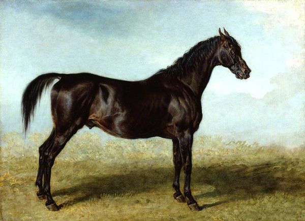 Curator: Géricault's "Spanish Horse in a Stable" really strikes me, it's a shadowy scene punctuated by the chestnut gleam of the horse's coat. What grabs you first? Editor: It has an immediate emotional pull. The animal is beautiful, yes, but also seems heavy with confinement. I find myself reflecting on themes of subjugation inherent to its station and the social implications of breeding such animals. Curator: Absolutely, the material reality of its existence as property is starkly conveyed. The thick application of oil paint suggests a hurried creation, a capturing of the animal's immediate presence. Notice how the stable setting is rendered so plainly, seemingly devoid of any romantic idealization? Editor: Yes, that austerity amplifies the broader socio-economic picture of the Romantic era and the rise of equestrian culture amidst industrial expansion. One wonders, were these animals symbols of luxury only attainable for some? The artist, a product of his privileged milieu, immortalizes the beast within that very structure. Curator: Indeed. It is crucial to consider his status when evaluating this piece. His class informs the consumption of the subject matter; how those materials-- the paint, the canvas-- become imbued with specific cultural weight based on the animal being captured. Editor: And within that stable setting, does this not provoke broader concerns about liberty, the ownership of life, and perhaps even ecological reflection? Gericault portrays this beautiful creature bound, but seemingly alert, reflecting perhaps societal shifts of recognizing dignity across species and perhaps beyond other intersectional spaces. Curator: The artist's labor in capturing it here serves as a lens through which we can understand labor, leisure, and the means of depicting, really making into art, that animal's condition within its social milieu. Editor: So, this "Spanish Horse in a Stable" serves as a complex narrative, layered with social dynamics and material truths, inviting us to question prevailing structures. Curator: It truly encapsulates how understanding those raw material components, the who, how, and why, deepens the artwork's message far beyond a pretty picture.