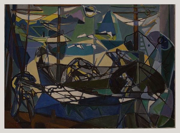 Curator: Richard Mortensen created "Gamla staden, opus 5" in 1948, utilizing acrylic paint to explore geometric abstraction, very much in the abstract expressionist style of the time. Editor: Wow, that's quite a mouthful. My immediate impression is controlled chaos. Angular shapes swimming in what seems to be white noise... but with splashes of brilliant, almost unnerving, blue. It kind of messes with your head, doesn’t it? Curator: Absolutely. The immediate postwar years saw many artists grappling with how to represent the shattered sense of order, and Mortensen’s use of fragmented geometric forms really embodies that. The work operates within the broader context of Modernism, and certainly questions traditional modes of representation. Editor: "Shattered" is the perfect word! Look how the lines clash and almost stab. And then that thick red bar on the left - it’s like a scream trapped on the canvas, isn't it? This isn't just shapes; there's angst pouring out! What's even more fascinating to me is the feeling of instability; this piece lacks any real anchor or sense of grounding. I feel a sense of anxiety creeping in just by observing. Curator: The title, "Gamla staden" or "The Old Town," adds another layer. Consider that perhaps Mortensen is attempting to represent memory and the way we often remember it through abstraction, rather than providing some accurate or historical visual document. This places Mortensen in direct conversation with many postwar movements interested in not merely portraying life, but expressing inner realities. Editor: Now you're talking! Memories... I can dig that. The overlapping, distorted geometry might represent how fractured those recollections become over time, and it’s less about seeing the streets literally but instead about communicating how we can reconstruct feelings and ideas through non-literal expression. And perhaps this is why I react to that vibrant yet subtle interplay. It feels very honest, but not polished. Curator: Exactly, it is that rawness combined with its intellectual grounding that distinguishes this work from so many other examples of Abstract Expressionism during this same time period. It holds its own! Editor: Indeed! This piece offers more than just a history lesson. It asks you to really FEEL it and remember what is often left unsaid. Thanks to Richard Mortensen!