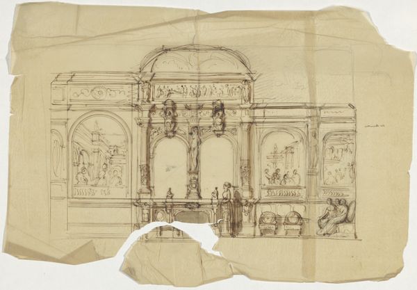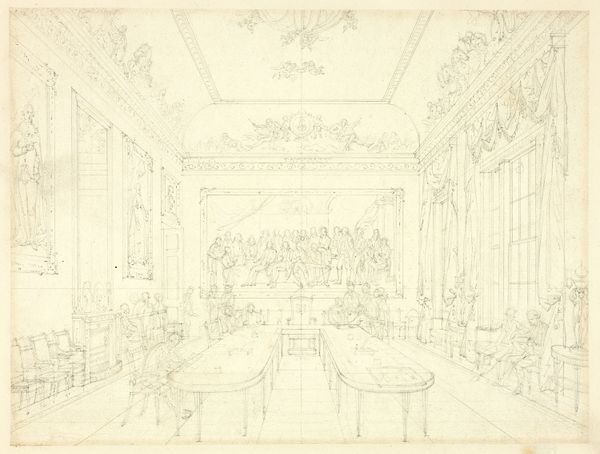 Editor: So, this is "Study for Wedgwood and Byerly, York Street, St James' Square from London in Miniature," created around 1809 by Augustus Charles Pugin. It's a mixed-media drawing on paper. It’s interesting, like looking at a rough draft… almost messy, yet elegant at the same time. How do you read this image, and particularly the context it comes from? Curator: What strikes me immediately is the glimpse it offers into the social world of consumption in early 19th-century London. Pugin’s detailed rendering of the Wedgwood showroom, with its neoclassical architectural elements, reflects a growing culture of public display and commercialism. It isn’t just a sketch; it’s a document of how goods were presented and consumed. Notice the carefully posed figures scattered around the scene; they emphasize a society with the means to contemplate luxury goods. How do you see that element playing into the drawing's effectiveness? Editor: It's interesting. The figures really do feel posed, not candid at all. Does that speak to the function of the artwork? Was this intended as advertisement? Curator: Perhaps indirectly. Drawings like this would often circulate amongst architectural circles and those involved in designing or commissioning spaces. It also offers a form of social signaling—of refined taste and awareness of design trends—which were critical to Britain's identity. The verso showing the “Sketches of Women, Cabinet” shows similar function, suggesting a world of wealth. We need to consider how images shape perceptions and solidify power dynamics. Does this change your initial understanding of the piece? Editor: It definitely does. I saw a preliminary sketch, but I see now how loaded this ‘simple sketch’ actually is! Curator: Precisely. By focusing on the cultural context, we start to uncover its layered meanings and purposes beyond its mere aesthetic value. Editor: Thanks so much. It gives me a better idea how commercial venues played a large social function as sites of consumption.