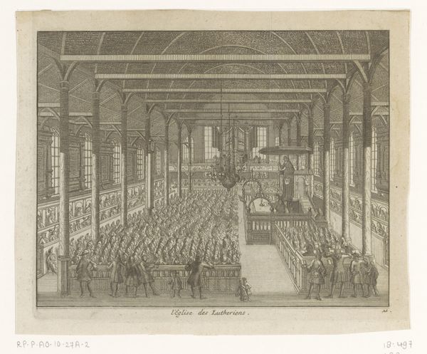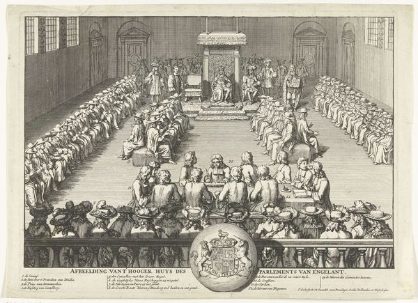 Curator: So many hats! That's my immediate impression. It's almost comical, all those somber faces topped with identical brims. What a gathering. Editor: This is a print depicting the opening of the National Synod of Dordrecht, held between 1618 and 1619. Look closely at the level of detail, especially the architectural elements. It’s quite impressive for an engraving of the time, isn’t it? All those people meticulously rendered. Curator: Meticulous, yes, and intense. You can almost hear the hushed whispers and feel the weight of the theological debate about to unfold. It’s visually very orderly, everything compartmentalized – almost rigid. Those lines are so tight! Editor: The Synod was a hugely important event, setting the theological direction of the Dutch Reformed Church for centuries. This print serves as a powerful visual record, idealizing the proceedings. It gives a sense of grandeur to what, at its core, was a political gathering, as it tried to standardize how religion operated, in a world with significant diversity of opinion. Curator: Do you think that uniform, hat-wearing crowd adds to that sense of orchestrated importance? I find it oppressive. It’s a visual argument for unity, perhaps papering over the actual divisions? I keep wanting one rogue hatless figure! Editor: Precisely! The hats enforce uniformity. The engraver, whoever he may be – the piece is anonymous – wants to emphasize the collective weight and solemnity of the event. Notice how the composition leads your eye toward the central figures at the head table, those elevated individuals making important choices. It's classic baroque design, directing our gaze where it needs to be, and thus structuring an understanding of that place. Curator: Structuring a narrative, I agree. Almost creating a stage where important decisions are revealed, though I bet, were not really agreed to quite in such harmony... It’s clever, but it feels so… deliberate. Editor: These prints served a purpose beyond just documentation, and a clear message beyond recording how people felt during a long process. They helped solidify the Synod's authority and project an image of a united and divinely sanctioned Church. That helps to create more of that impression for generations beyond 1618! Curator: It makes me consider all the silent stories hidden beneath those hats. Editor: A potent reminder that images are never neutral records but are, rather, carefully constructed arguments.