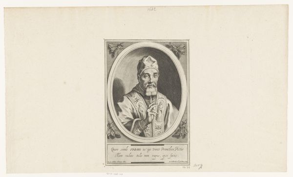 Gaetano Vascellini created this print of Cardinal Jacopo Ammannati. The composition has a formal symmetry, with the cardinal centrally placed and framed by a draped curtain, which evokes a sense of classical portraiture, yet the engraving's monochrome palette and fine lines give the artwork a certain distance. The cardinal's pose, holding a book, signifies knowledge and authority. The composition invites us to consider the semiotic codes of power and intellect embedded in the image through symbolic elements such as the cardinal's attire and the carefully inscribed text below the portrait. Vascellini skillfully uses line and texture to articulate form and convey a sense of depth. The hatching and cross-hatching techniques create subtle gradations of light and shadow, thus lending a tactile quality to the figure. The overall effect of the artwork is not merely representational. It suggests a complex interplay between the subject's identity and the symbolic language of representation, thus prompting the viewers to decode the cultural and intellectual meanings embedded within its structure.