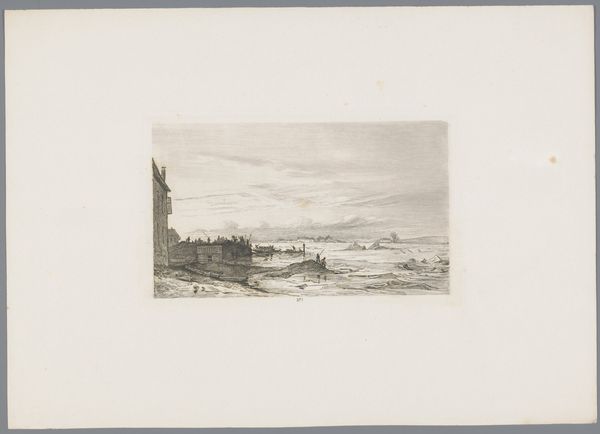 Editor: This is Félix Brissot de Warville's 1881 etching, "Schaapsherder met kudde," or "Shepherd with Flock." It feels incredibly textural despite being a print. What's striking is how the density of the etched lines creates a tangible sense of form. How would you interpret this piece purely from a visual perspective? Curator: Indeed. Immediately, the hatching and cross-hatching command attention. Note how the artist employs it to delineate depth and volume. Observe the shepherd and the sheep – the variation in line weight and density models the play of light, accentuating their three-dimensionality, wouldn't you agree? Editor: Yes, the light is captivating, how the sky is almost white and the animals seem much darker in contrast. Does that inform its meaning, or just describe it visually? Curator: Precisely. One might further deconstruct the formal elements: the distribution of light, the organization of forms in space. Ask yourself, how does the tonal range--from the faintest grays to the richer blacks--articulate space and contribute to the overall visual balance? The almost mathematical relationship between light and dark directs our gaze and structures our experience. The strategic placements of light, form, and shadow construct not merely a scene, but a calculated visual field. Editor: I see it now, like a detailed study in texture and shape. I'm starting to see how line variations almost define form more than actual outlines do. Curator: Exactly, and how the relationship between each mark helps articulate the scene without overtly symbolic reference. The composition's integrity lies in its inherent visual mechanics. Editor: I never looked at prints so analytically before; it really pushes one to look more closely. Thanks for guiding me!
