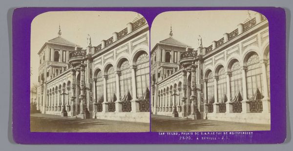 Editor: So, this is "Woonhuis van Rubens in Antwerpen," or Rubens' House in Antwerp, from between 1873 and 1890. It’s a photograph of the building’s facade, but it’s also presented as a stereograph – those double images you view with a special device for a 3D effect. It makes the architecture feel imposing, almost like a stage set. What captures your eye about this image? Curator: Oh, what doesn’t grab my eye! First, that photographic sepia tone; it immediately transports you to another era, doesn’t it? The past bleeds through, literally. Beyond that, it is so clearly trying to create something more out of the mere capturing of this amazing house that it goes beyond the factual recording of architecture. We’re seeing a romanticized version of history, designed to be admired through the special lens of the stereoscope. Think of it: holding a piece of Rubens’ world in your hands, experiencing it with depth. Editor: So it's less about architectural documentation and more about creating a feeling, a connection to the past? Curator: Precisely. It is trying to evoke an emotional response and stir your imagination. These stereographs were popular entertainment, weren't they? A window to the world and other times that would otherwise be unseeable for those holding them. Editor: That really shifts my perspective on it. It’s not just a picture of a building, it’s a curated experience. Curator: Indeed! The photographer becomes a storyteller, weaving fact and feeling, and creating not just an image, but a shared sense of wonder. Something tells me old Peter Paul himself would have loved this photographic attempt to create space.