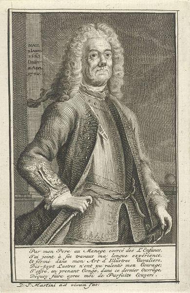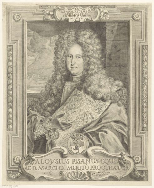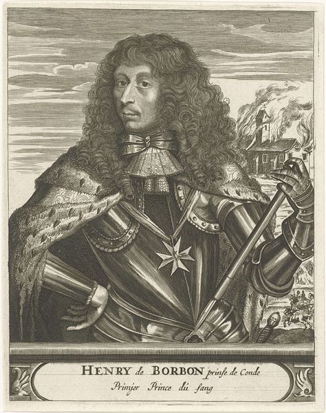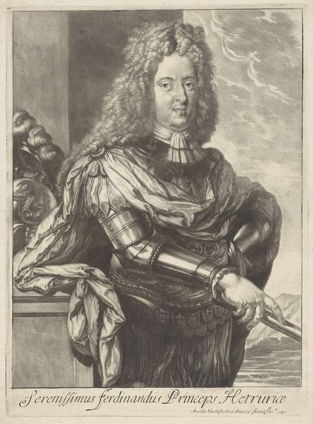 Curator: This is Pieter de Jode II's "Portret van Christina van Zweden," an engraving dating sometime between 1628 and 1670. Editor: Immediately striking. The rendering of armor paired with her seemingly effortless, voluminous hair creates a stark contrast, doesn't it? There's an interesting push and pull between power and… something softer. Curator: I agree. Considering de Jode’s meticulous work with engraving, it is useful to remember this is about a system of mechanical reproduction as much as a work of portraiture. Here the printing press is leveraged to circulate power. Think of the implications around disseminating images of a monarch, especially one as complex as Christina. Editor: Absolutely. And Christina herself! Known for her intellect, her abdication of the throne, and eventual conversion to Catholicism… she challenged norms at every turn. Seeing her depicted in armor, which has such heavy historical symbolism regarding masculinity, is very revealing. How do we read this concerning gender? Curator: One can’t overlook the traditional aspects either, right? The very precise engraving imitates the effect of metalwork which suggests an elite object produced by highly trained artists. Yet printmaking offered multiple originals at a fraction of the cost compared to single commissions of painted portraits or sculpture. The materials and processes were central to broader social changes. Editor: The inscription at the bottom feels key, too. "Christina Regina." Emphasizing her royalty… but also maybe subtly pushing back against the controversy surrounding her decisions? The inscription feels very deliberate; almost performative in its assertion of her status. The act of engraving becomes, itself, a political declaration. Curator: The Rijksmuseum holding this in its collection demonstrates enduring fascination. We grapple even now with how public images influence power dynamics. The intense lines on Christina’s armour make you consider how power can feel constricting or like something which needs defending. Editor: Right, the armor speaks to societal expectations and the protection of sovereignty. The way she leans casually against what appears to be a classical plinth makes her claim power while challenging traditional presentations. Her image, mass produced and circulated, contributes to her historical persona as one that straddled numerous different identities, religious and otherwise. Curator: Looking closely reveals the layers, literal and metaphorical, in constructing identity via reproducible materials. The print allows for distribution far and wide, playing a key role in shaping narratives. Editor: Ultimately, it seems, the means of production, the act of distribution, and Christina's own life interweave to produce a multifaceted image of power, intellect, and defiance. A woman creating a very active public persona through images.