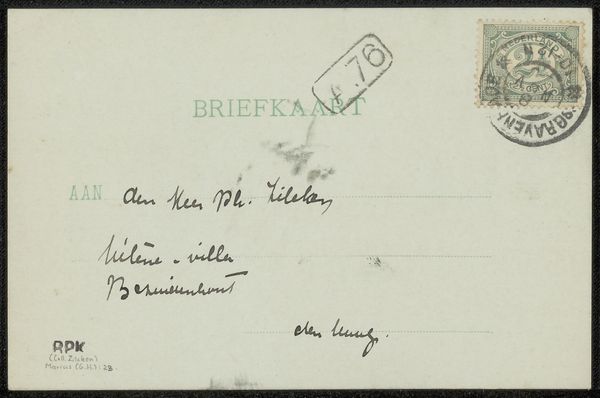 Curator: We’re now viewing "Briefkaart aan A. van der Boom," a mixed-media drawing and calligraphy piece on paper, possibly created between 1926 and 1930 by Richard Nicolaüs Roland Holst. Editor: It looks very intimate, like a handwritten note rapidly sent from one friend to another. The pale tan paper with dark, angular lettering and the cancelled stamp suggests immediacy. Curator: The compositional balance stems from its asymmetrical organization of text blocks versus empty space. Roland Holst contrasted crisp handwriting with looser cursive styles; it is a fascinating duality in text structure. Editor: The calligraphy is really the centerpiece, its deliberate forms and careful flourishes creating visual layers of symbolic language. It’s fascinating how such everyday materials gain iconic status. A physical link between sender and receiver. Curator: Exactly. The tension comes from Roland Holst juxtaposing the conventions of standardized postal communication – printed card, postage – with personalized hand inscription. Editor: Seeing that handwritten message evokes nostalgia, a kind of wistful longing for that tangible era, before the efficient but often sterile digital exchange we’re used to today. Did he write anything especially interesting, though? Curator: The tone conveys warmth and affection. Although some words are indecipherable, he does seem to express fondness for small gestures and appreciation of another, signed off in endearment before concluding it with the statement ‘Back home’. It seems highly personal in sentiment. Editor: The cancelled postage even enhances the overall composition. This humble postcard reveals how layers of personal contact become a type of shared symbolism, especially over time. Curator: Yes, viewing “Briefkaart aan A. van der Boom” makes me recall the emotional weight intrinsic to simple structural forms when combined intentionally. Editor: Ultimately, through symbolic handwriting, Holst allows for a timeless intimate gesture beyond its intended function, or time.