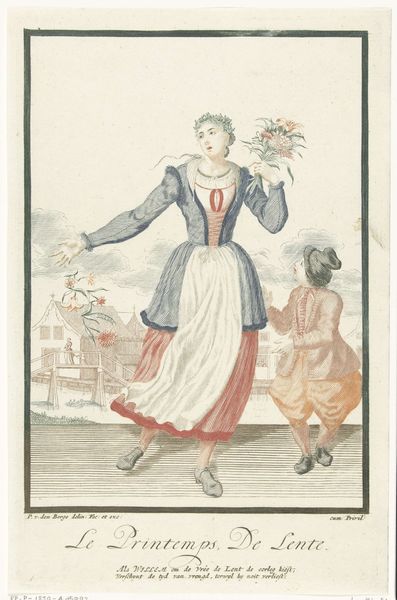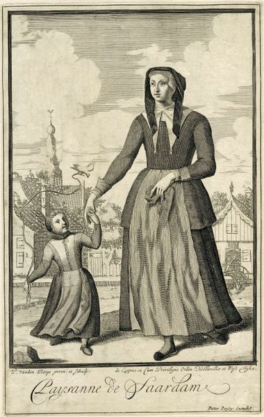 This print, *Boerin uit Zaandam*, shows a woman from Zaandam with her child, and was created by an anonymous artist. The image is made through engraving, a printmaking technique that involves cutting lines into a metal plate, inking it, and pressing it onto paper. The engraver's skill is evident in the intricate details of the woman's clothing, the folds and textures rendered with astonishing precision. Looking closely, you can see the lines that build up the image, cross-hatching to create areas of shadow and depth. The engraver has also captured the social identity of the figures. The woman’s clothing speaks volumes about her status and role in society. The labor involved in producing textiles and garments was immense. The choice of materials and the style of dress reflect the region's culture and economy. Understanding this print means looking beyond the image itself. Consider the labor and materials that went into making it, as well as the social context in which it was created. Only then can we appreciate the true depth and complexity of this artwork, and the ways in which it connects to the world around it.