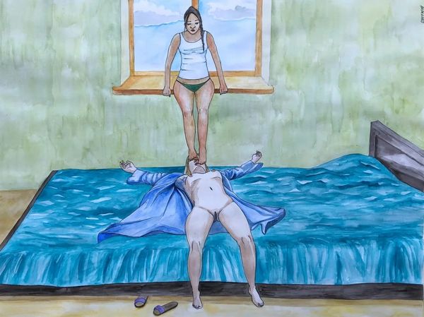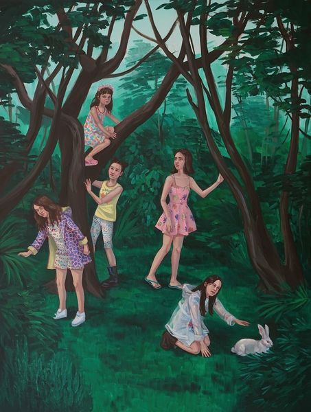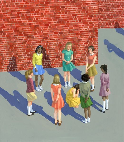 Curator: Zoe Hawk’s "Into the Deep," painted in acrylic in 2022, presents a staged scene at a swimming pool, rich in visual tension and thematic suggestion. Editor: It gives me an uncanny feeling, almost like a still from a David Lynch film—these synchronized swimmers poised to dive into a disturbingly calm pool. Everything is so perfectly, coldly, balanced. Curator: Coldly balanced? I find that intriguing. Given that Hawk's background incorporates elements of craft and design, and acrylic's own industrial production… well, does this material aspect of the painting process itself contribute to this "coldness"? Editor: Possibly. Acrylic, being so synthetic and easily molded into consistent colors, flattens and simplifies things here, making everything smooth, perfect, somehow inhuman. Unlike oils that give softness and glow. I wonder what kind of conversations were going on between Hawk and her chosen media while crafting this uncanny scene? Curator: I see the utility and choice of materials, the deliberate simplification. Note the numerical divisions, marking a calculated segmentation of the space. How might the artist, by emphasizing spatial control and uniformity through such choices, be drawing our attention to systems of measurement or institutional structures? Is Hawk positioning her art practice in the context of, say, swimming culture and associated modes of production and spectatorship? Editor: Perhaps the repetition hints at an assembly line: bodies prepped for display. Then one wonders about the water's symbolism, is it the oblivion from our social theater? Curator: Precisely. Her work invites us to ponder how societal conventions might shape behavior or affect modes of expression and representation, particularly for female bodies in constructed social spaces like the pool environment. Editor: You make a point! That one solitary girl diving is set in sharp contrast against those perfectly posed automatons, no? The individual is jumping into her subconscious against the rigid collective? This picture feels like the opening act of an existential thriller now! Curator: That kind of personal reading certainly illuminates additional avenues for interpretation of both the narrative and materials. A rich dialogue. Editor: Indeed. Made me re-evaluate my own… pool antics. Let's just say my backstroke doesn’t involve anywhere near that kind of grace!