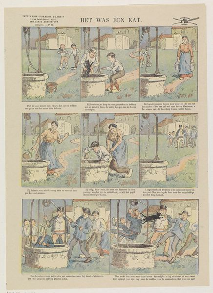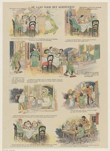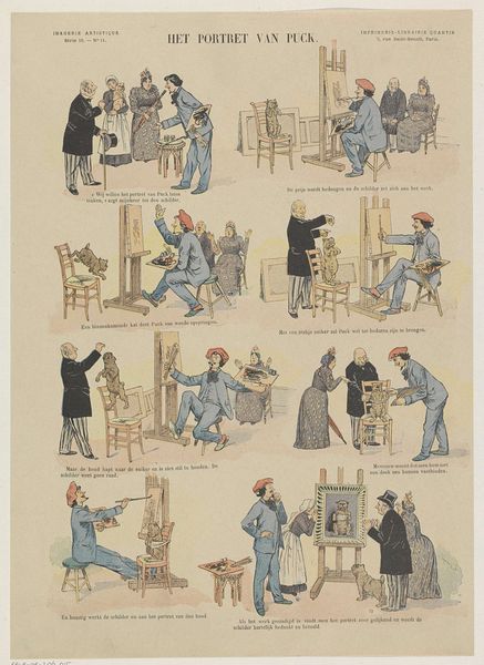 Curator: Welcome. We’re standing before a lithograph entitled "Een leelijke grap," which translates to "An Ugly Joke." The work was produced by Paul Albert Steck sometime between 1876 and 1897. Steck was, of course, working in a time when printmaking was experiencing something of a resurgence, particularly within commercial applications. Editor: It feels like a storyboard from a forgotten silent film. Each panel, framed almost like windows, tells a tiny, self-contained story—but they all string together, creating this sense of build, this slow burn of…well, of an ugly joke! Curator: Absolutely. Steck utilizes the format of a comic strip, something that was becoming increasingly popular at the time. But more than mere entertainment, it offered artists like Steck an accessible way to engage with societal observations—to use humor as a lens through which to view the world. Consider how consumerism is lampooned here, via these ridiculous piles of canned goods. Editor: Exactly! Stacks and stacks of tinned food that end up in complete disarray. It makes you think about abundance…but also the inherent ridiculousness of that excess. Also the dogs. I'm sort of fascinated by the little dog in each of the scenes. Is it a pet or more of a street mutt, running from scene to scene? Is the dog complicit in this prank? Curator: What I find compelling is how this comic also engages in a larger discourse concerning the rise of a merchant class and new urban spaces of trade and commerce in Europe. These were often portrayed—not necessarily accurately—as rife with deceit and scheming, and that these behaviors might permeate all facets of social exchange. It’s social commentary, really. Editor: Absolutely. But back to this comic-strip construction… I find the format does create a lovely visual rhythm, where your eye bounces back and forth between these little moments of everyday life. Curator: Indeed, and the subtle variations in color from frame to frame provide a quiet dynamism to the experience. It asks a great deal of its viewers. It begs viewers to make these subtle inferences. To engage with a narrative unfolding in six vignettes. A skill in critical thinking! Editor: Yes! Paul Albert Steck's “An Ugly Joke” leaves us with more questions than answers. The enduring power of humor in exposing societal foibles continues to provoke dialogue and consideration today. Curator: Well put! We do hope that by observing Paul Albert Steck’s composition today, and dissecting the cultural moment that birthed it, one comes to recognize its significance.