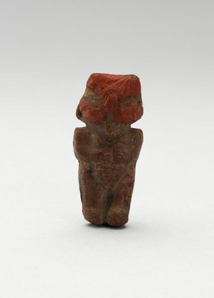 Editor: This small ceramic sculpture, *Mold-Made Female Figurine*, dates from around 100-600 CE and was crafted by the Moche culture. There's a solemn feeling about this portrait. How would you interpret it, looking at it from your perspective? Curator: I think it's essential to consider this figurine within the larger social context of the Moche civilization. This piece's existence points to established social hierarchies and the use of art to reinforce those systems, doesn't it? Editor: That makes sense. How would a mold impact how widely available something like this could be? Curator: Precisely! Mass production suggests that its purpose may extend beyond mere personal devotion. It also prompts questions about gender roles, power dynamics and who controlled image production in Moche society. What impact might controlled replication have? Editor: Maybe it democratized access to some representation of power but simultaneously reinforced whatever social narratives it presented. So, looking at this one, the female figure is clearly presented frontally with her hands on her stomach. Would that represent something significant, too? Curator: Exactly! Her stance and presentation hint at the multifaceted roles women had in that culture. Her presentation isn't passive, right? How does it communicate her agency, and what social conditions granted women such visibility? Also, where was this likely displayed, and who was supposed to see it? Editor: This piece is so small; perhaps it could've been a personal object, used as a representation of empowerment. I see how this unassuming figurine holds many cultural and political narratives worth exploring. Curator: Indeed. It reminds us that art is not made in a vacuum but within a network of social relations and political agendas, rewarding a more profound reading.