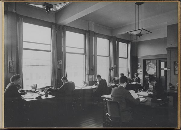 Editor: This photograph, "Teekenzaal," was created by Atelier Kurkdjian sometime between 1931 and 1934. I am struck by its quiet formality, and how the monochrome palette really focuses my attention on the people within this light-filled room. What do you see in this piece? Curator: The photograph indeed evokes a sense of order, but consider also the psychological weight of repetition. Each figure mirrors the other in pose and garment, creating a collective identity rather than celebrating individuality. Think about what it meant, historically, to represent a group in this way during this era. What anxieties or power dynamics might this seemingly simple scene be concealing? Editor: That's a fascinating perspective! The uniformity didn't immediately strike me as loaded, but the matching white attire and nearly identical poses do suggest a system of control or perhaps assimilation? Curator: Precisely. Look also at the traditional headwear amidst the colonial-era architecture. Doesn't it speak to the push and pull of cultural identity, the attempt to blend the traditional with the modern or perhaps the imposition of one over the other? Editor: I see it now – there's a silent conversation happening about cultural memory versus imposed structure. Thanks, I never would have looked this closely. Curator: Indeed, images, even seemingly simple ones, carry emotional and cultural resonance. Our understanding deepens as we become aware of the layers beneath the surface.