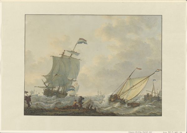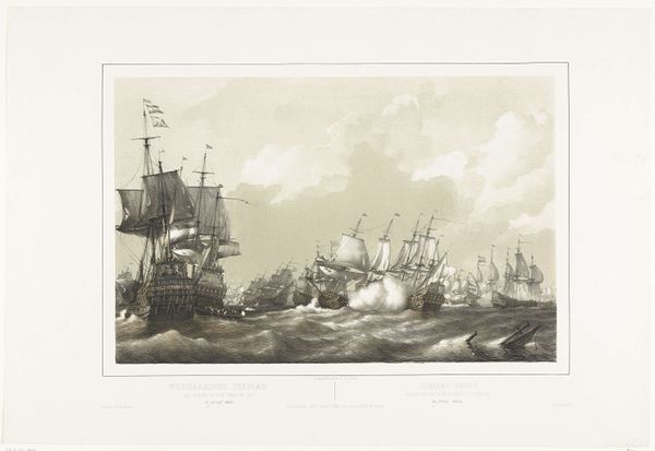 James Fittler's engraving, "Slag bij Kamperduin, 1797," masterfully captures the chaos of naval warfare through its dynamic composition and intricate detailing. The scene is dominated by swirling clouds of smoke and tumultuous waves. These elements evoke a sense of the sublime, echoing Romantic ideals of nature's overwhelming power. Fittler employs a dense network of lines to delineate the ships, figures, and sea, creating a complex interplay of light and shadow. Note how the diagonal lines of the ship masts and rigging intersect. These cut through the horizontal waves to create tension and instability. The engraver uses light and dark to draw the eye through the scene. The semiotic analysis reveals the cultural codes of naval power and conflict. Ships become signs of national strength, and the battle itself is a spectacle of human struggle against nature and each other. The engraving functions not only as a historical record but also as a powerful articulation of the sublime. It shows how nature and technology collide in spectacular and terrifying ways.