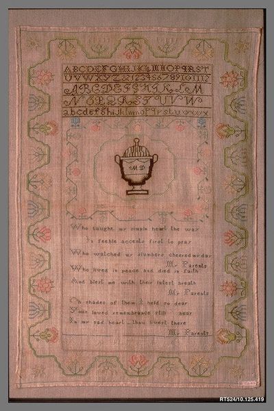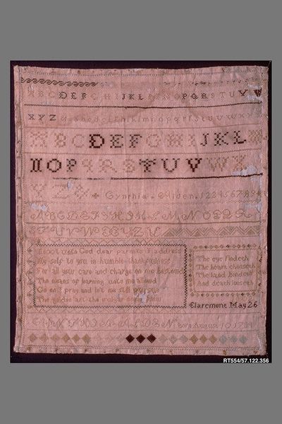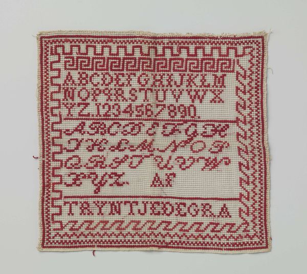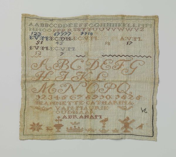 Caroline Carleton created this embroidered sampler in 1819 when she was just nine years old. The muted browns and creams give the piece an antique feel, a sense of delicate age. The texture of the fabric and the meticulously stitched letters invite a close, intimate viewing. Arranged in neat rows, the alphabet repeats in varying styles, creating a structured yet decorative composition. The upper section features alphabets, with the stitch-work acting as a structural element that organizes the sampler's surface. Below, Carleton’s name and a brief dedication are stitched, grounding the piece in personal history. The sampler challenges conventional notions of childhood creativity. Instead of free-form expression, we see disciplined skill. The structure of the sampler and its formal, almost mathematical arrangement of letters and patterns, emphasizes a system of order and learning. It's a testament to both Carleton’s skill, and the values of education and discipline in the 19th century.